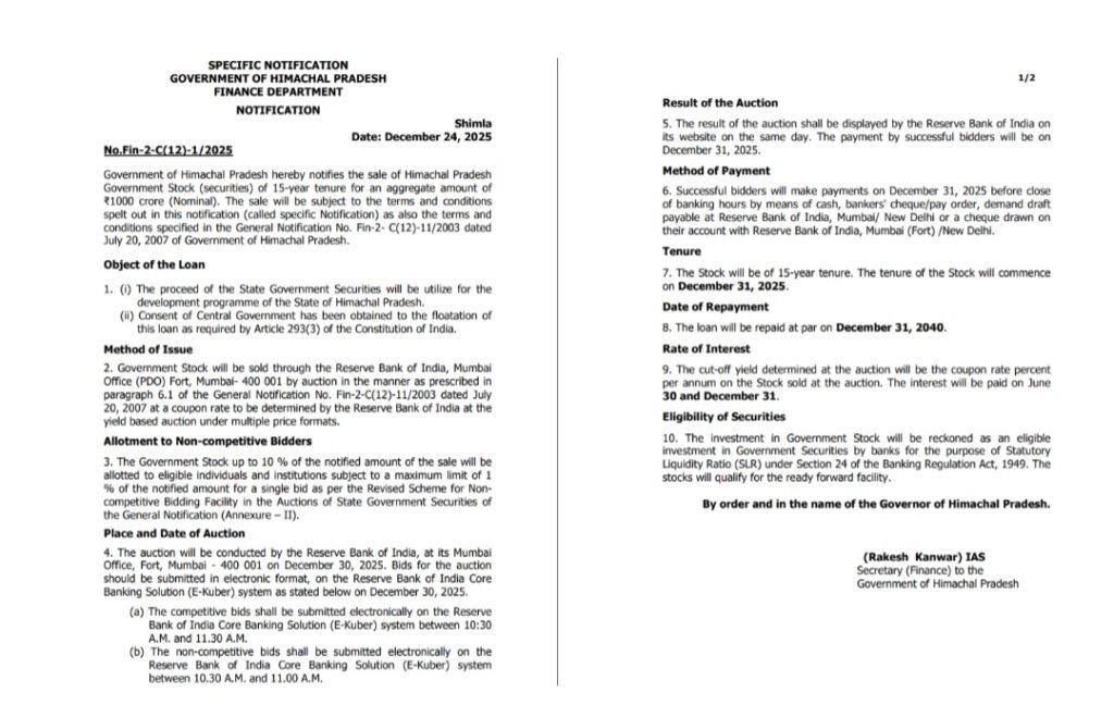 शिमला-26 दिसंबर. नए साल यानी 2026 में प्रदेश सरकार एक बार फिर कर्ज लेने जा रही है. सुखविंदर सिंह सुक्खू के नेतृत्व वाली कांग्रेस सरकार साल शुरू होने से एक दिन पहले एक हजार करोड़ रुपए का कर्ज लेगी. सरकार यह कर्ज 15 साल के लिए ले रही है. वित्त विभाग की तरफ से अधिसूचना जारी कर दी गई है. वित्त विभाग के सचिव IAS राकेश कंवर की तरफ से जारी की गई.