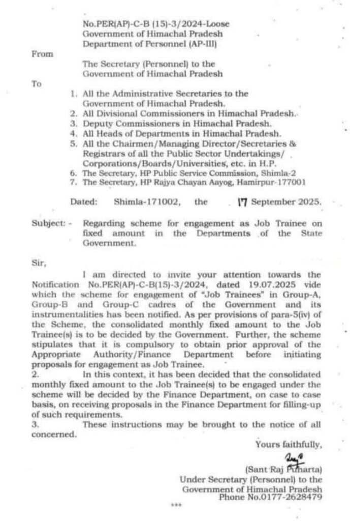 शिमला-18सितंबर. प्रदेश सरकार ने “जॉब ट्रेनी” के रूप में नियुक्त किए जाने वाले उम्मीदवारों को दिए जाने वाले मासिक निश्चित मानदेय को लेकर एक महत्वपूर्ण आदेश जारी किया है। यह आदेश राज्य के सभी प्रशासनिक सचिवों, विभागाध्यक्षों, आयोगों, निगमों एवं विश्वविद्यालयों के रजिस्ट्रारों को संबोधित किया गया है।