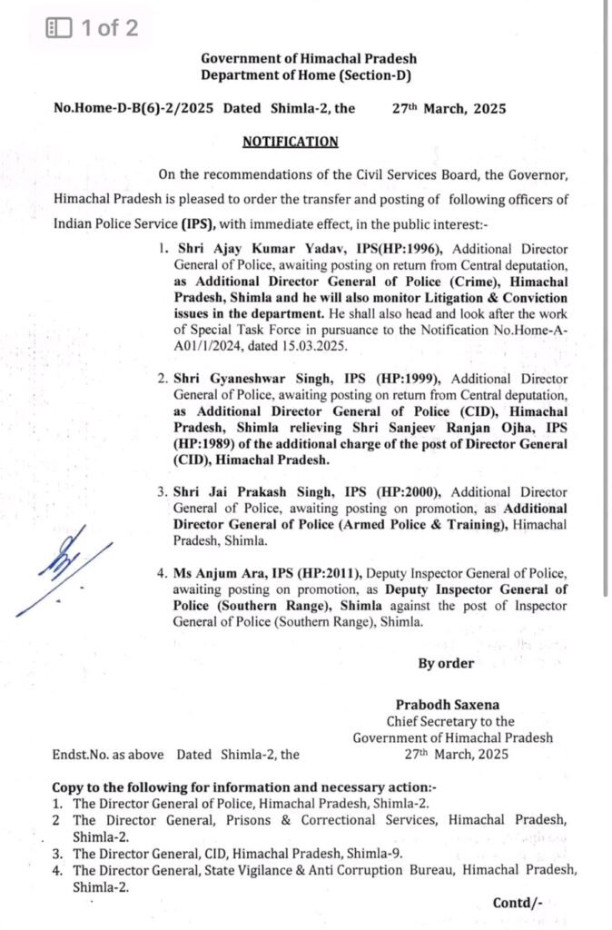 शिमला-27 मार्च. प्रदेश सरकार ने चार आईपीएस अधिकारियों के स्थानांतरण व तैनाती आदेश जारी किए हैं। इस आदेशों के तहत केंद्रीय प्रतिनियुक्ति से वापसी पर नियुक्ति की प्रतीक्षा कर रहे एडीजी जय कुमार यादव को अतिरिक्त पुलिस महानिदेशक (अपराध) के पद पर तैनात किया गया है। साथ ही वे विभाग में मुकदमेबाजी और दोषसिद्धि के मुद्दों की निगरानी भी करेंगे। साथ ही सरकार की ओर से अधिसूचित विशेष कार्य बल के कार्य का नेतृत्व और देखरेख भी करेंगे। इसी तरह केंद्रीय प्रतिनियुक्ति से लाैटे आईपीएस अधिकारी ज्ञानेश्वर सिंह को अतिरिक्त पुलिस महानिदेशक (सीआईडी) के पद पर तैनाती दी गई है। वे महानिदेशक (सीआईडी) संजीव रंजन ओझा को अतिरिक्त कार्यभार से मुक्त करेंगे। वहीं पदोन्नति के बाद तैनात का इंतजार कर रहे आईपीएस अधिकारी जय प्रकाश सिंह को अतिरिक्त पुलिस महानिदेशक (सशस्त्र पुलिस एवं प्रशिक्षण) लगाया गया है। इसी तरह आईपीएस अधिकारी अंजुम आरा को पदोन्नति पर उप पुलिस महानिरीक्षक(दक्षिणी रेंज) शिमला के पद पर तैनाती दी गई है।