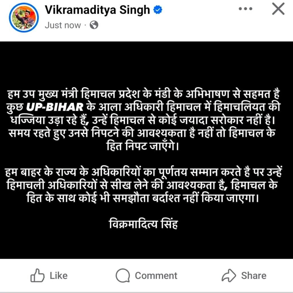शिमला-13जनवरी. लोक निर्माण मंत्री विक्रमादित्य सिंह की फेसबुक पर की गई एक टिप्पणी को लेकर राजनीतिक और प्रशासनिक हलकों में विवाद खड़ा हो गया है। अपने पोस्ट में उन्होंने मंडी में उपमुख्यमंत्री के भाषण का समर्थन करते हुए कहा कि कुछ बाहरी राज्यों, विशेषकर यूपी-बिहार के आला आईएएस/आईपीएस अधिकारी हिमाचल में “हिमाचलियत की धज्जियां उड़ा रहे हैं”। उन्हें हिमाचल से कोई ज्यादा सरोकार नहीं है। समय रहते हुए उनसे निपटने की आवश्यकता है नहीं तो हिमाचल के हित निपट जाएँगे।विक्रमादित्य सिंह ने कहा कि हम बाहर के राज्य के अधिकारियों का पूर्णतया सम्मान करते है पर उन्हें हिमाचली अधिकारियों से सीख लेने की आवश्यकता है, हिमाचल के हित के साथ कोई भी समझौता बर्दाश्त नहीं किया जाएगा। जब तक हिमाचल में हों हिमाचल के लोगों की सेवा करो, शासक बनने की गलती ना करो।